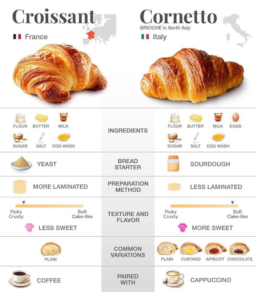 Croissant: Có nguồn gốc từ Pháp nhưng bắt nguồn cảm hứng từ bánh kipferl của Áo. Croissant trở thành biểu tượng của ẩm thực Pháp với công thức cải tiến từ bột cán lớp và bơ. Nguyên liệu: Làm từ bột mì, men, bơ, đường, muối và sữa. Croissant chứa hàm lượng bơ cao hơn Cornetto, tạo ra kết cấu nhiều lớp và giòn tan đặc trưng. Kết cấu: Lớp vỏ giòn và xốp với kết cấu “cán lớp” rõ rệt, nhờ kỹ thuật lamination (cán bột với bơ nhiều lần). Thường ăn trơn hoặc kết hợp với bơ, mứt, hoặc socola. Đây là món ăn sáng cổ điển ở Pháp, thường đi kèm với cà phê hoặc trà. Dùng nóng hoặc ở nhiệt độ phòng để tận hưởng độ giòn. Có cấu trúc nhiều lớp giòn tan, đặc biệt khi bẻ ra sẽ thấy các lớp bột mỏng chồng lên nhau. Vỏ ngoài vàng nâu, thường không nhồi nhân (trừ một số phiên bản biến tấu như pain au chocolate).